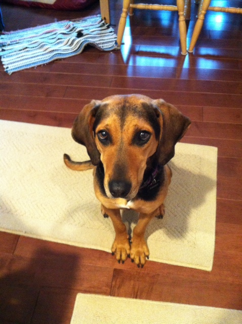 We had a dog visit us over the weekend. Her owners are friends of ours and they accompanied her (or she accompanied them?) to our house for some hanging out on Saturday. She is a very sweet dog who didn’t mind if our daughter was a little shrieky or wanted to pet her. She did mind our cat though…and our hardwood floors.